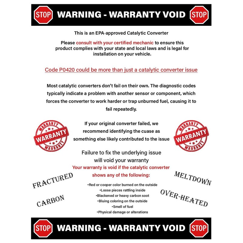 Do not install this product without first diagnosing and repairing the conditions that caused the original to fail. Diagnosis by a trained automotive professional is highly recommended. Installing this converter without determining the root cause of the failure will severely damage the new converter. Converters damaged by an improperly running engine will be denied warranty coverage by the manufacturer. Due to the State of New York emission regulations, this catalytic converter cannot be installed on California emission-equipped vehicles that are registered in the State of New York.