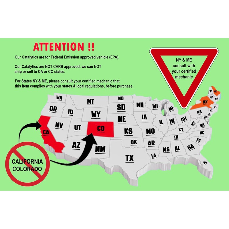 WARNING !! Do not install this product without first diagnosing and repairing the conditions that caused the original Catalytic to fail. Diagnosis by a trained automotive professional is highly recommended. Installing this Catalytic without determining the root cause of the failure will severely damage the new Catalytic. Catalytics damaged by an improperly running engine will be denied warranty coverage by the manufacturer. Due to the State of New York emission regulations, this catalytic cannot be installed on California emission-equipped vehicles that are registered in the State of New York.