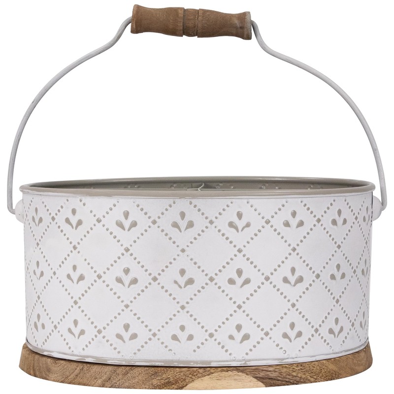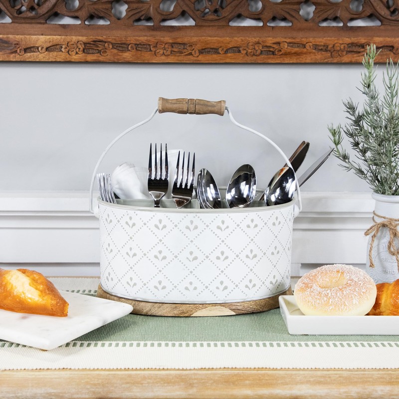 Northlight 10" White Oval Embossed Utensil Caddy with Handle and Wood Base