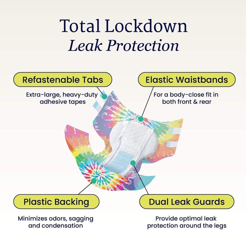 NorthShore MegaMax Adult Overnight Diapers, 12-Hour Tab-Style, Small, 4 Count Trial, Tie-Dye, 24-34 inches, Unisex Incontinence Underwear