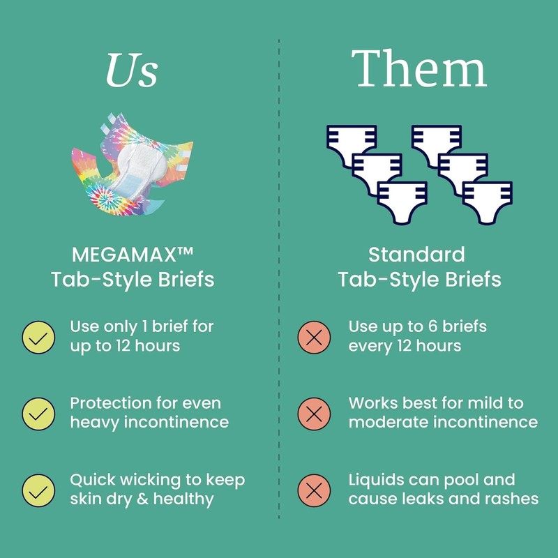 NorthShore MegaMax Briefs are tab-style adult diapers for men, women, and larger children. MegaMax disposable refastenable incontinence underwear provide reassuringly strong protection for even the heaviest bladder and/or bowel control leaks or floods.