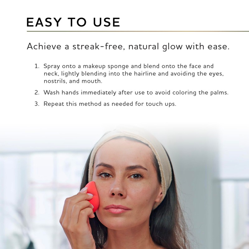 • EASY, CLEAN APPLICATION: Unique pump spray applicator evenly dispenses product for a seamless, believable, and beautiful facial bronzing application. No streaks, no splotches, no spots! Perfect for on-the-go, touch-up tanning anytime, anywhere. Just spray lightly onto make-up sponge and gently blend on face and neck for a gorgeous bronze glow.