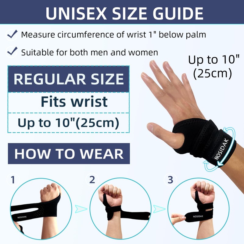 - SEPARATE LEFT/RIGHT HAND: NOSIDAK provides Separate Left and Right Wrist Brace choices to meet the different demands of customers. NOSIDAK Wrist Wraps fit both men and women, adult or youth. We recommend you check the size before ordering. Maximum Wrist Circumference Up to 10"(25cm).
