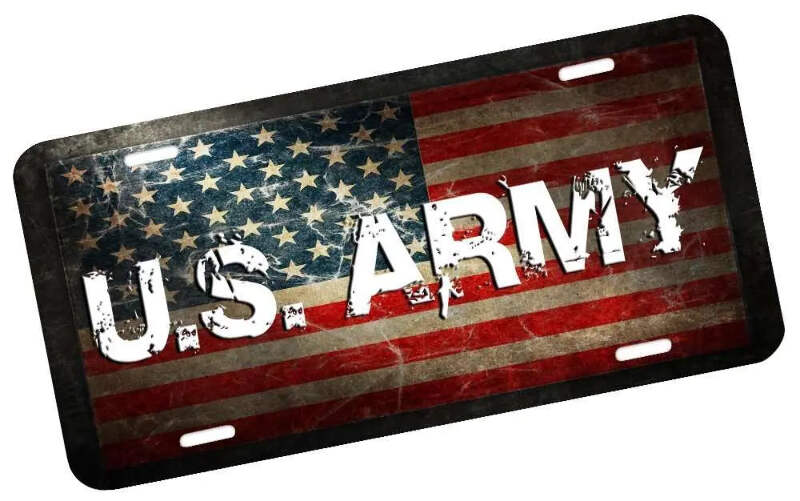 U.S. Army License Plate Made of High Quality Material Designed to take a beating outdoors for years. License plates are .060 aluminum Designed and produced in the U.S.A. 3 year outdoor warranty. Free American Flag with every order U.S. Army License Plate which has a 3 year outdoor warranty. All of our License Plates are made from High Quality Material which is designed to take a beating outdoors for years. Our products are designed and produced in the U.S.A. Complementary 2.5 x 3 inch flag decal with every order.U.S. Army License Plate