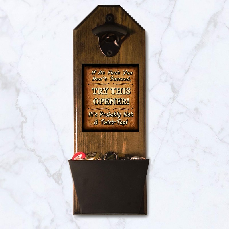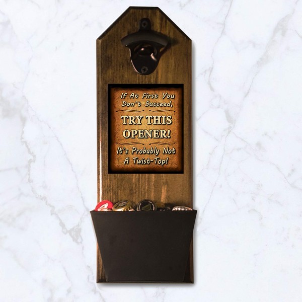 "Not a Twist Top" Wall Mounted Bottle Opener and Cap Catcher - Handcrafted by a Vet - 100% Solid Pine 3/4" Thick, Rustic Bottle Opener & Slide On & Off Bucket - Great Gift