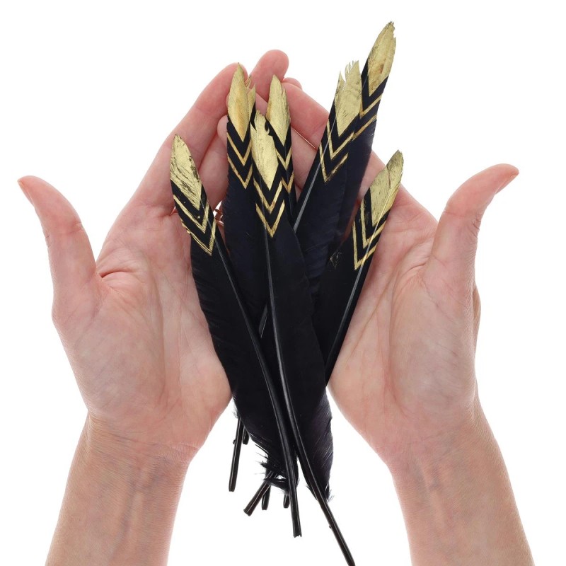 Leisure Arts Feathers Painted Black/Gold 30pc adds a sophisticated touch to any craft or decor project. Each pack contains 30 real bird feathers in a striking black color, with a metallic gold design painted on the tip for a stylish, decorative flair. Measuring approximately 6"-8" in length, these decorative feathers are perfect for a variety of uses, from crafting and DIY projects to event decor. The natural variation in each feather ensures no two items are identical, making each piece truly unique. These feathers can be used as elegant hat feathers for cowboy hats or to add a special touch to fashion accessories. They also work wonderfully as hat feathers for women, bringing a hint of glamour to hats, fascinators, or headbands. Use them to create distinctive centerpieces, embellish wreaths, or add an artistic element to scrapbooks and greeting cards. As real bird feathers, they offer a touch of authenticity and charm to any project. Whether you're decorating for a special event or adding some stylish accents to your wardrobe, these versatile feathers will elevate your creations. Their eye-catching design and natural elegance make them ideal for all kinds of artistic projects and decor needs.