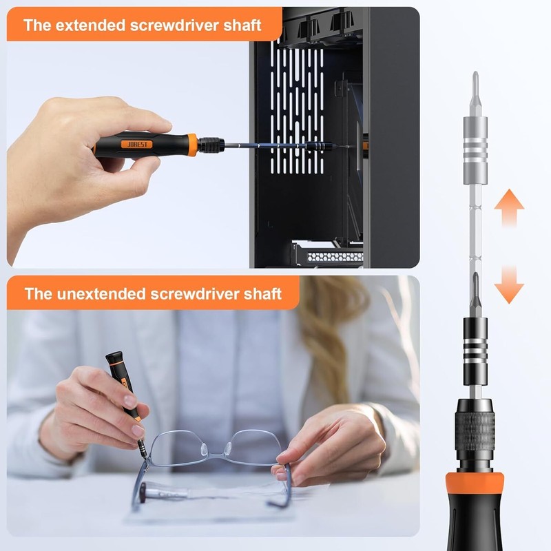 - 【Unique Handle Design and CRV Material】 The screwdriver handle is made of TPR and PP materials, the tail is rotatable, and it adopts an extended tool bar design. The length of the tool bar can be adjusted, making it easy to reach deep for disassembly. Screwdriver bits are made of high-quality CRV steel, which is wear-resistant and has high hardness.
