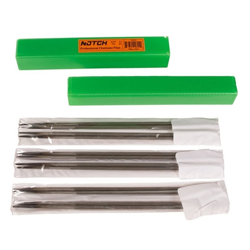 Notch’s new line of chainsaw files are a great value: long lasting round chainsaw files delivered in a reusable case. Classic spiral cut. Different sizes are distinguished by color coded stickers so you can keep them straight in your toolbox.