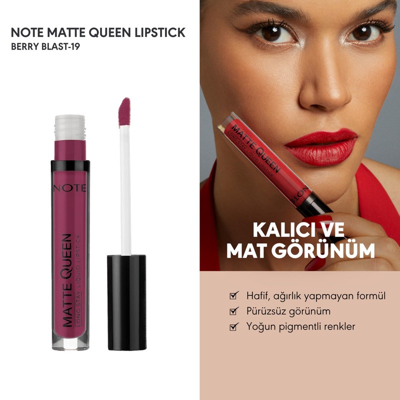 Note Cosmetique Matte Queen Lipstick Kalıcı Mat Likit Ruj, 19 Berry Blast, Mor