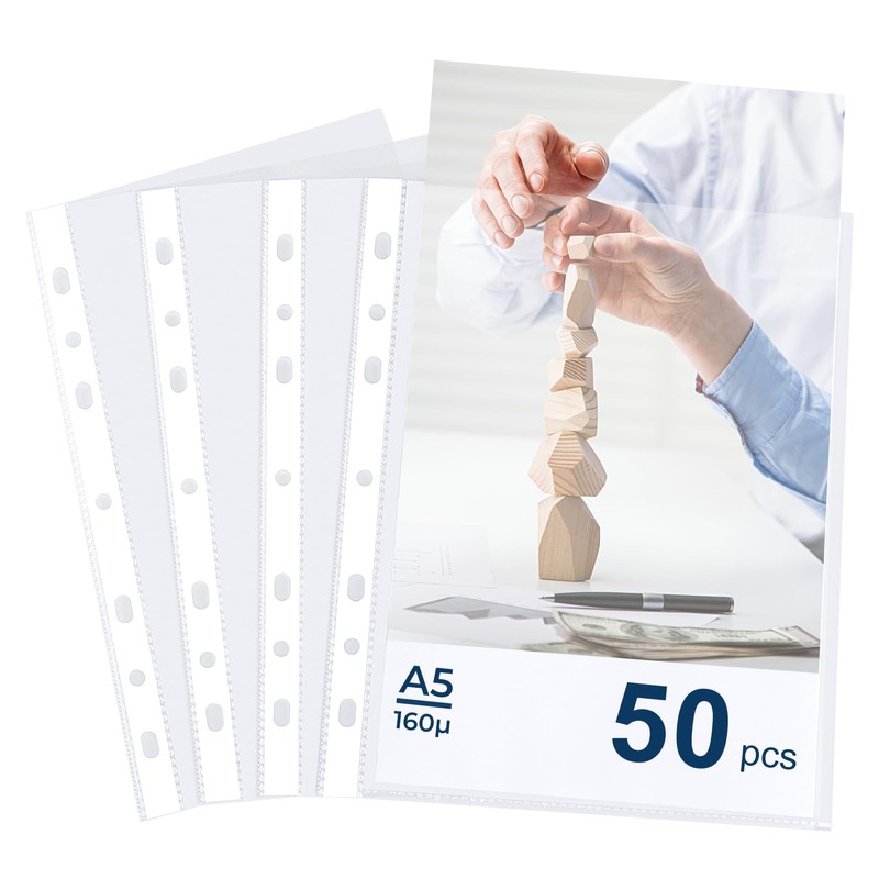 - 【A5 Plastics Filling Paper Cover】50 Top Opening Punched poly pockets per single pack with size of 16.9cm X 21.5cm/6.6 X 8.5 in.These a5 file holder securely hold A5 documents,better protect paper from damage ideal for home, office and professional use.