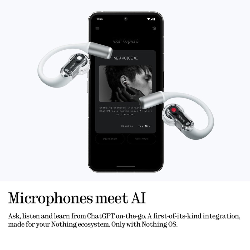 - Performance and Smart Integration: The Nothing Ear (open) features a unique integration with ChatGPT for voice control across your Nothing ecosystem (Only on Nothing earbuds when connected to CMF & Nothing phones.), allowing you to access information seamlessly via bespoke widgets, Microsoft Swift Pair, and Google Fast Pair, along with AAC and SBC audio support, LED charging indicators, and pinch controls