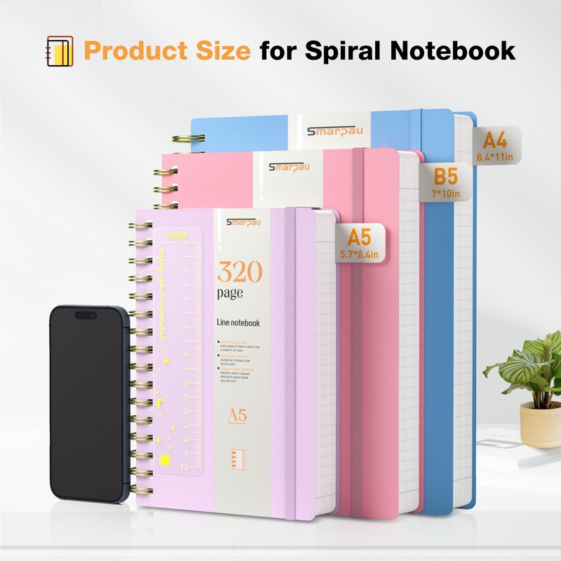 - A4 thick notebook: A5 spiral notebook with a total of 320 pages/160 sheets, offers plenty of space to write, you can fully record your ideas, plans, notes. Measuring 21.5 x 28 cm, it is ideal for putting it in your bag or taking it with you on your usual trips