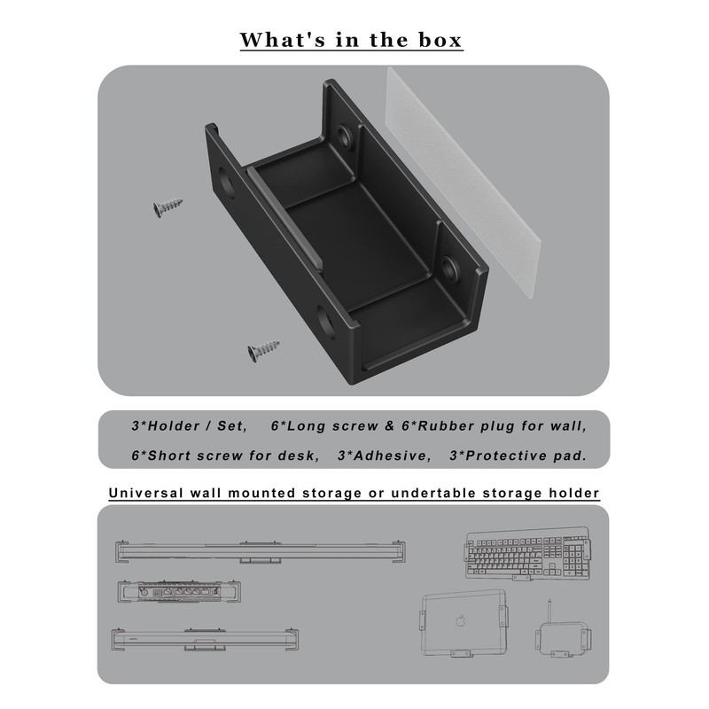 - Easy Installation: There are two ways to fix the under desk laptop tray: screw fixation and adhesive fixation. Short screws fit under table fixing the holder, long screws and rubber plugs are suitable for wall fixing the holder, The adhesive works on both walls and under tables. You can choose the appropriate installation method based on the size and weight of the device.
