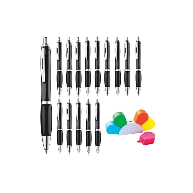 noTrash2003 50 Stück ergonomischer Kugelschreiber Kulis Druckkugelschreiber in trendigen Farben für Gewerbe, Gastronomie, Haushalt, Schule im Sparset mit gratis Textmarker inklusive (Schwarz)