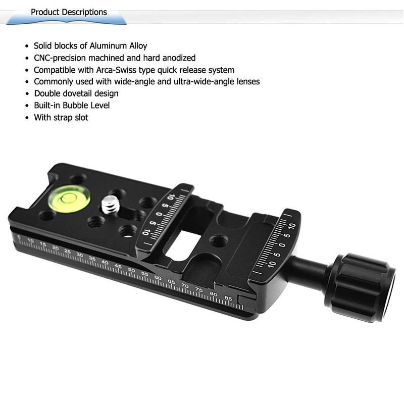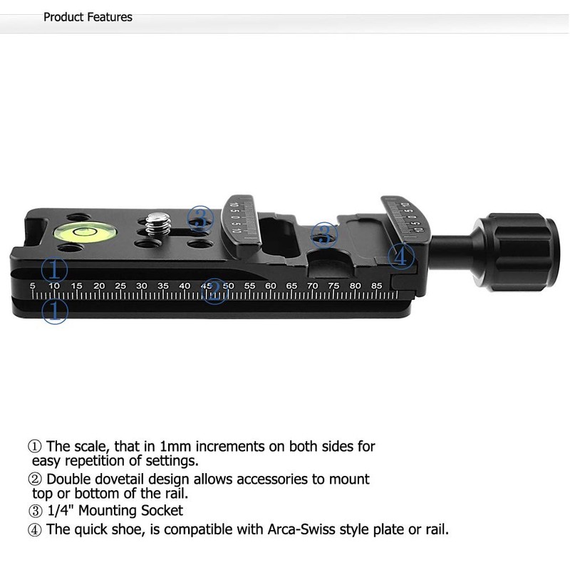 • The ali groove on the rail is compatible with Arca-Swiss style quick release systems.