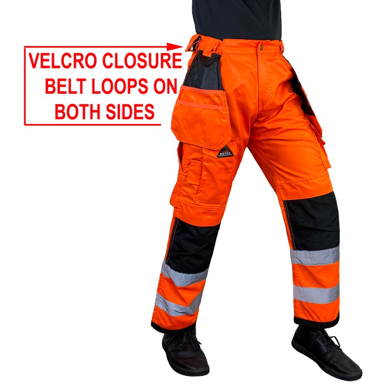 - Notus High visibility Hi Vis Cordura Reinforced Holster Pockets pants, featured with 2 front pockets and 2 split Holster Pockets with Tool Loops. Left 3 splits and Right side has dual split pockets & pouches. On Left side one large cargo pocket and one small cargo pocket with Velcro closure. Right side has dual split Pouches with hammer or tool loop.