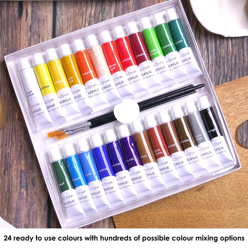 Nova Acrylic Paint (24 Pack) 12ml Each-3 Free Brushes – Blendable, Quality Pigment, Vibrant Colours – Non-Toxic – Beginners & Professionals-Perfect for Canvas & Paper – British Brand, Assorted