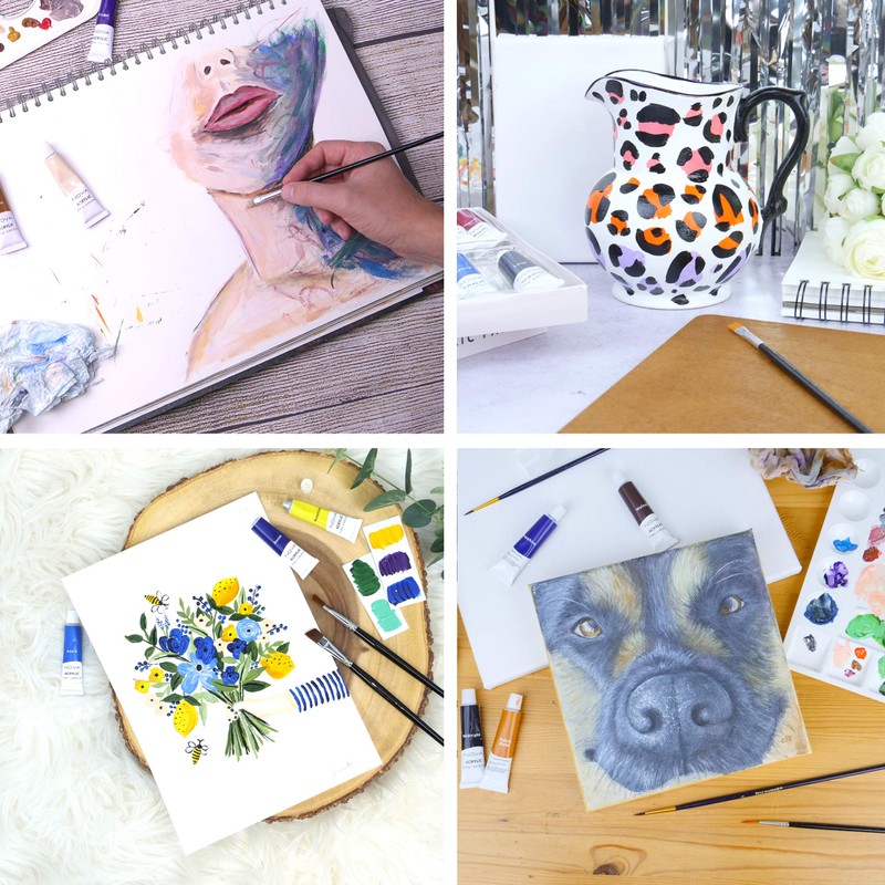 - Brushes included get started right away with the 3 paintbrushes included in the set – and keep your paints organised and neat with the reusable storage box This acrylic paint is suitable for different projects from modern calligraphy, lettering and card making to scrap booking. Non-toxic and safe to use by both adults and kids. Great for scenery, abstract, wall art, landscape and fine portrait paintings