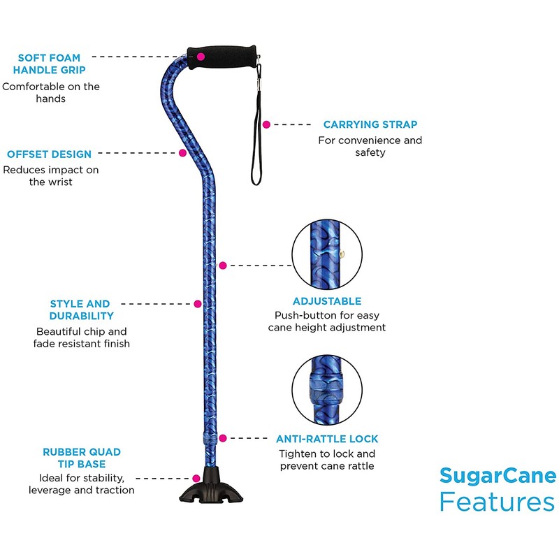 • WE LOVE THE SUGARCANE because is the perfect combination of style, quality and cane mobility. It comes with the ALL TERRIAN QUAD TIP base that stands the SugarCane upright on flat surfaces, provides great stability, traction and pivot on uneven and sloped terrain. The Soft Grip offset handle design is so comfortable reduces strain on the hand and wrist. Comes with a convenient carrying strap