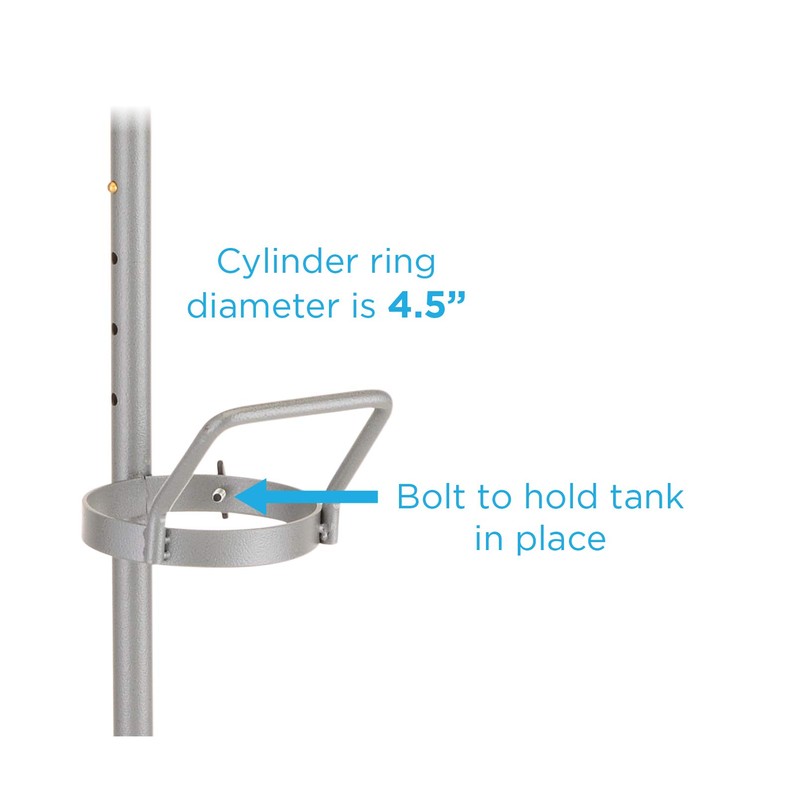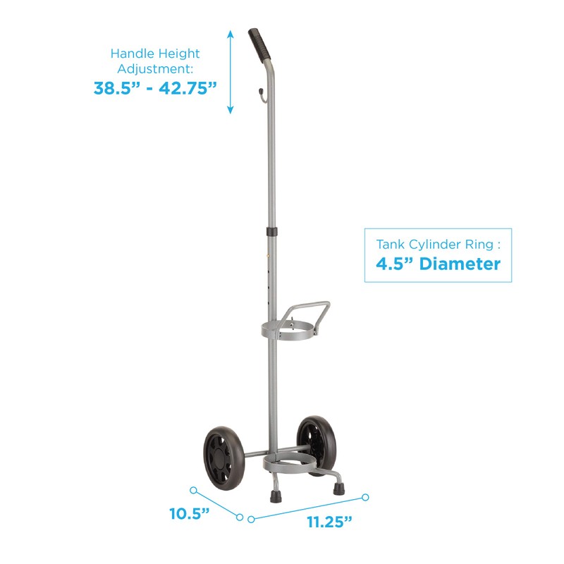 • ROLL AND CARRY YOUR OXYGEN CART WITH EASE. The two wheels with front base design makes it so easy to roll, carry, stand up and travel with your oxygen cart. COMES ASSEMBLED - just insert and adjust the handle to your desired height. Cylinder ring diameter is 4.5” and includes a screw bolt to secure the tank in place.