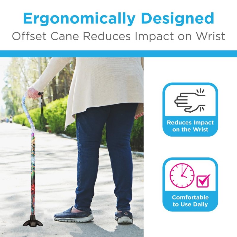 Nova Joy Designer Offset Quad Cane for Seniors - Unisex Adjustable Lightweight Walking Aid with Foam Handle, Wrist Strap and Anti-Rattle Lock - Essential Mobility Support - Proud Peacock