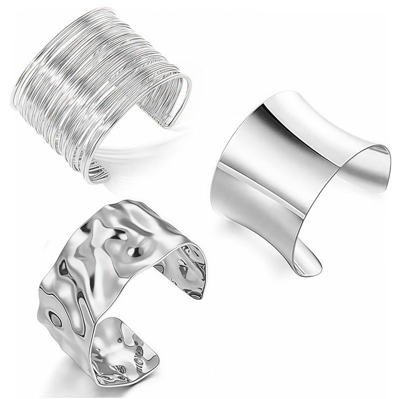 - Silver cuff bracelets: this set of 3 silver chunky cuff bracelets gives any outfit a tough but elegant touch. The irregular, minimalist open designs offer a modern look.