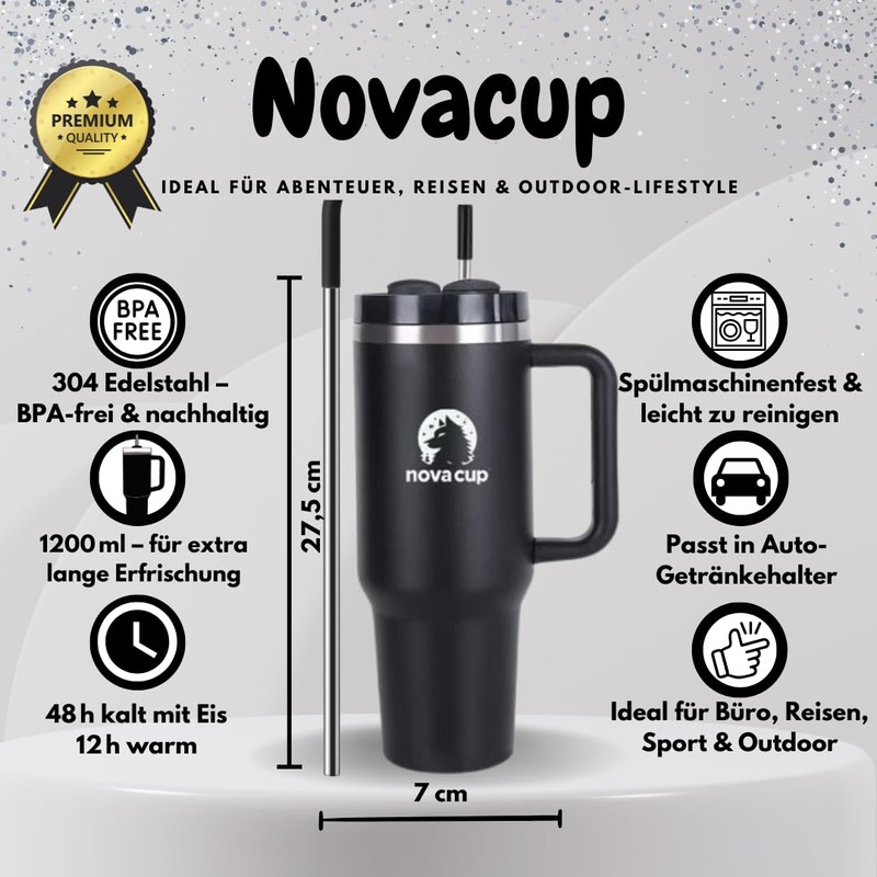 - Fits in cup holders - stylish & practical Sleek, modern design with sturdy handle - fits perfectly into standard cup holders. Novacup is the stylish to-go mug for coffee, tea or water - ideal for every day on the go.