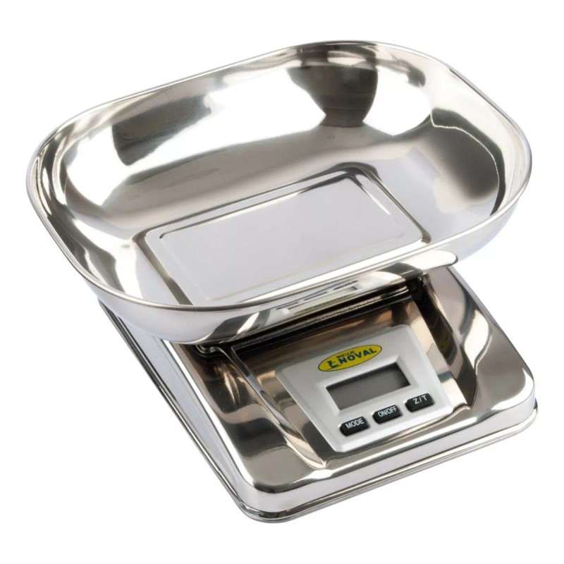 BÁSCULA DIGITAL PARA COCINA CON CHAROLA DE ACERO INOXIDABLE Y CAPACIDAD DE 5 KILOS MARCA NOVAL.