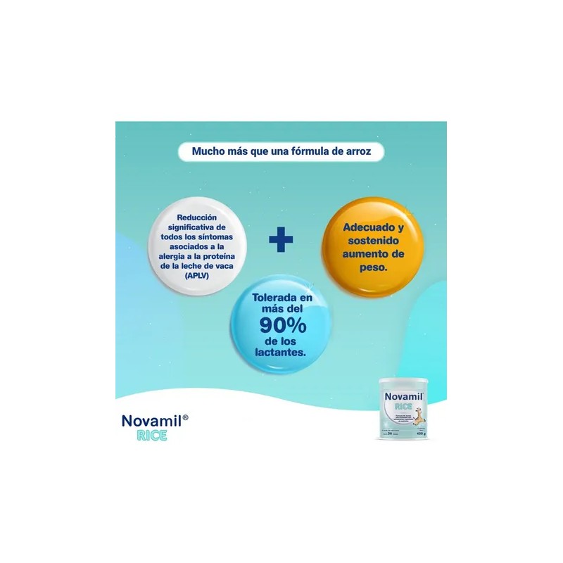 "NOVAMIL RICE Es una FÓRMULA Infantil NO LÁCTEA para lactantes con necesidades especiales de nutrición, a partir del nacimiento y hasta los 36 meses de edad con PROTEÍNA DE ARROZ HIDROLIZADA.