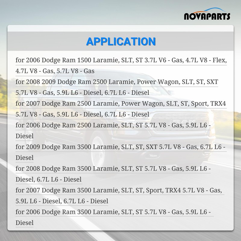 for 2009 Dodge Ram 2500 Laramie, Power Wagon, SLT, ST, SXT 5.7L V8 - Gas, 5.9L L6 - Diesel, 6.7L L6 - Diesel