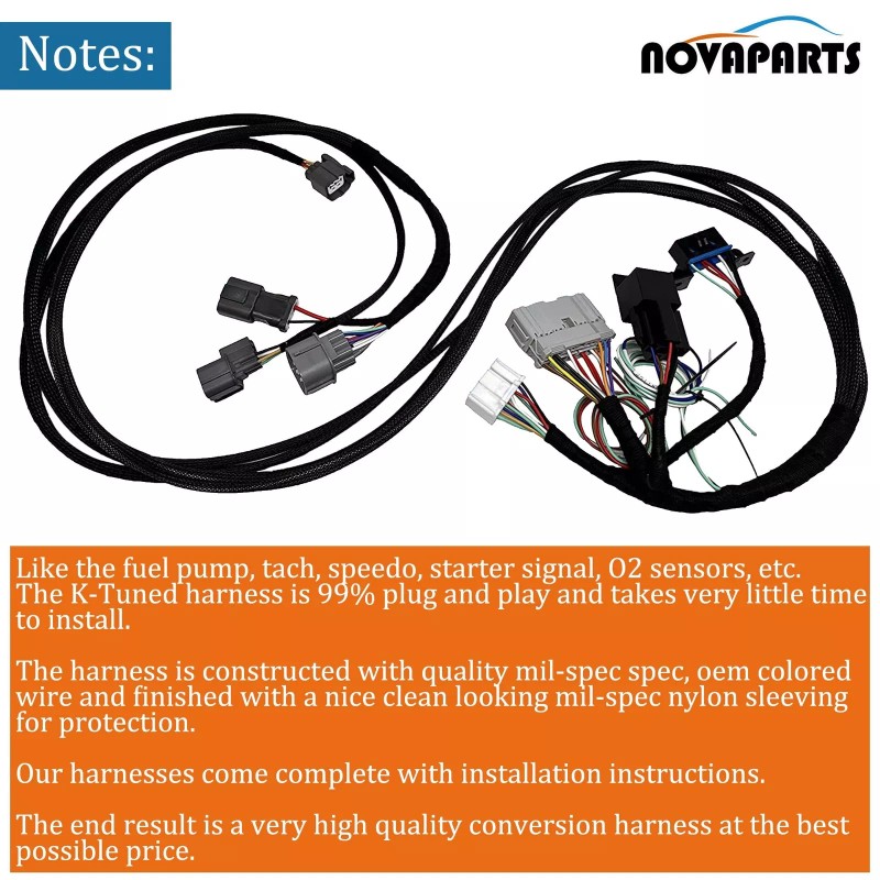Notes: Like the fuel pump, tach, speedo, starter signal, O2 sensors, etc. The K-Tuned harness is 99% plug and play and takes very little time to install. The harness is constructed with quality mil-spec spec, oem colored wire and finished with a nice clean looking mil-spec nylon sleeving for protection. Our harnesses come complete with installation instructions. The end result is a very high quality conversion harness at the best possible price. Application: for (94-01) Acura Integra w/ K swap for (92-95) Honda Civic w/ K swap