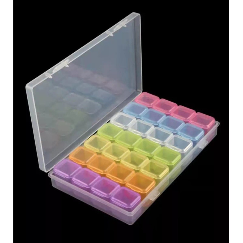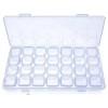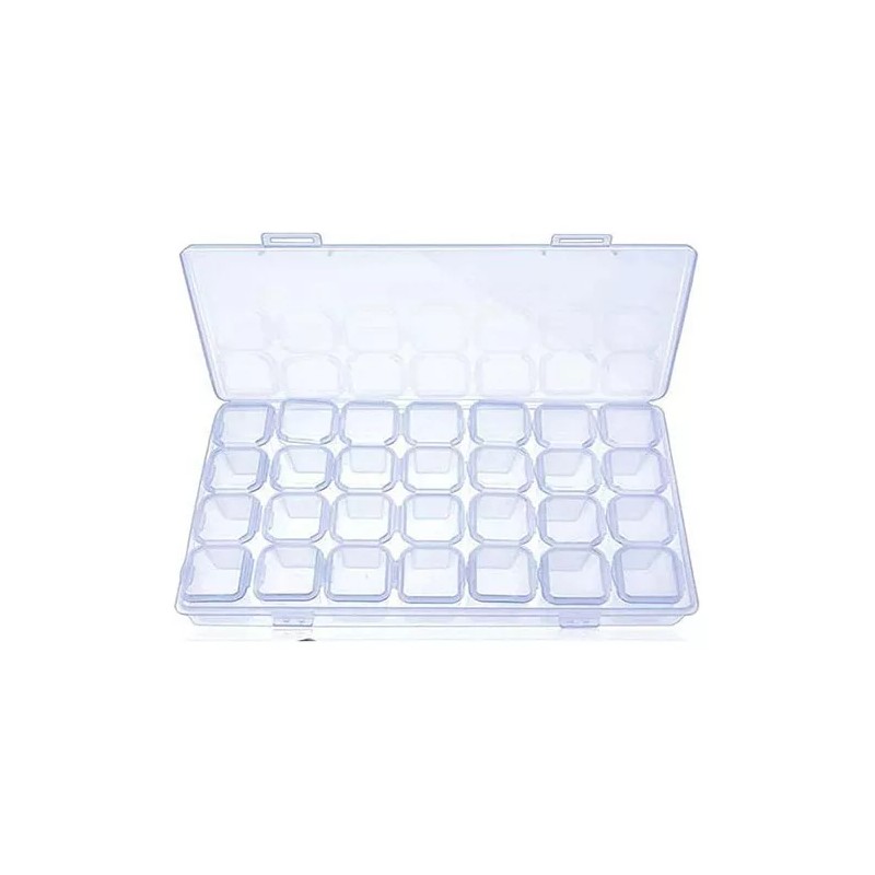 28 ranuras transparentes envases de pintura de diamante, por lo que puedes ver el contenido interior claramente, cada compartimento se cierra bien y se sella bien, por lo que el contenido no se derrame. Es fácil para usted poner la etiqueta o escribir un número de marca en cada contenedor, muy fácil de mantener organizado. Tamaño: aprox. 17 x 11 x 2.5 cm.