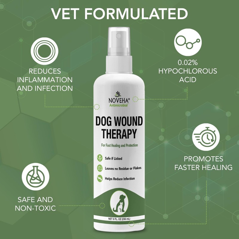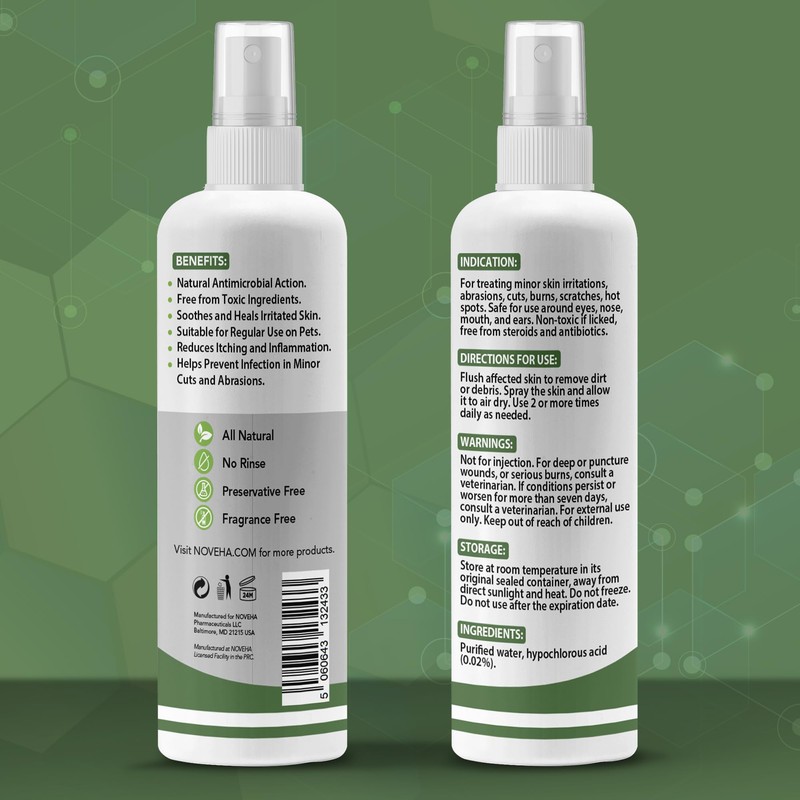 Discover the ultimate solution for your pet's skincare with NOVEHA Dog Wound Therapy Spray. This all-natural spray soothes minor skin issues, cuts, burns, and hot spots using the gentle power of hypochlorous acid. Safe and effective for all animals, it reduces itching and promotes faster ease without any residue.