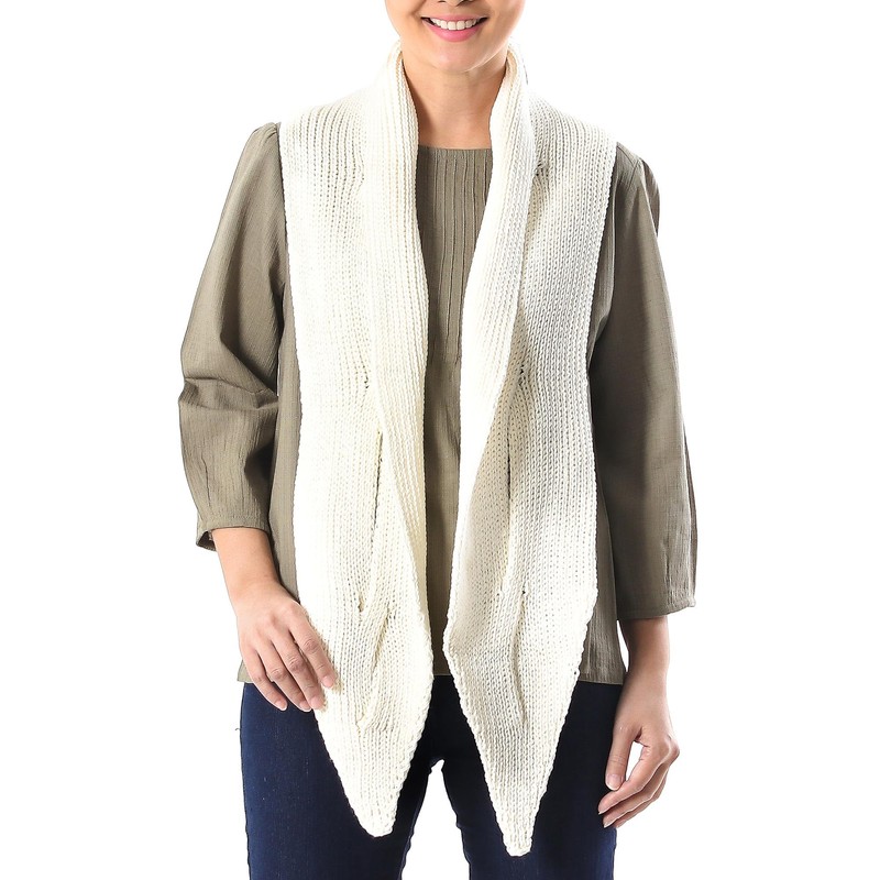 NOVICA Artisan Handmade Cotton Scarf Knit Wrap in Eggshell from Thailand Accessories Scarves Ivory Solid Travel Friendly ' Ascot Charm in Eggshell'