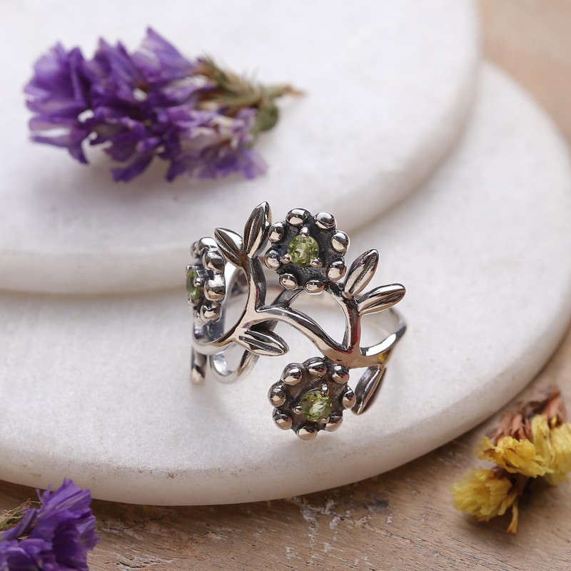 About this item: Beautiful wildflowers glimmer with green hues, crafted by hand of sterling silver with a combination of finishes. Presented by Chintan, the cocktail ring is finished with three stones of faceted peridot.