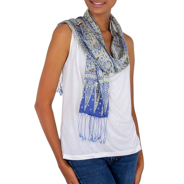 NOVICA Artisan Handmade Silk Batik Scarf from Indonesia Blue Multicolor Accessories Scarves Wrap 'Royal Java Blue'