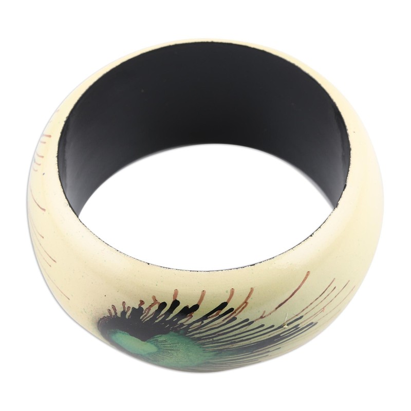 About this item: Handcrafted from local haldu wood, this stunning wooden bangle celebrating the beauty of peacock feathers is presented by Vipin in India. The middle panel of the bangle features an intricately designed peacock feather motifs in bright green, black, and brown. The inner panel of the bangle features a black coat, which contrasts nicely with the vivid outside colors. The bangle also has a lacquered finish to provide a glossy appeal.