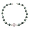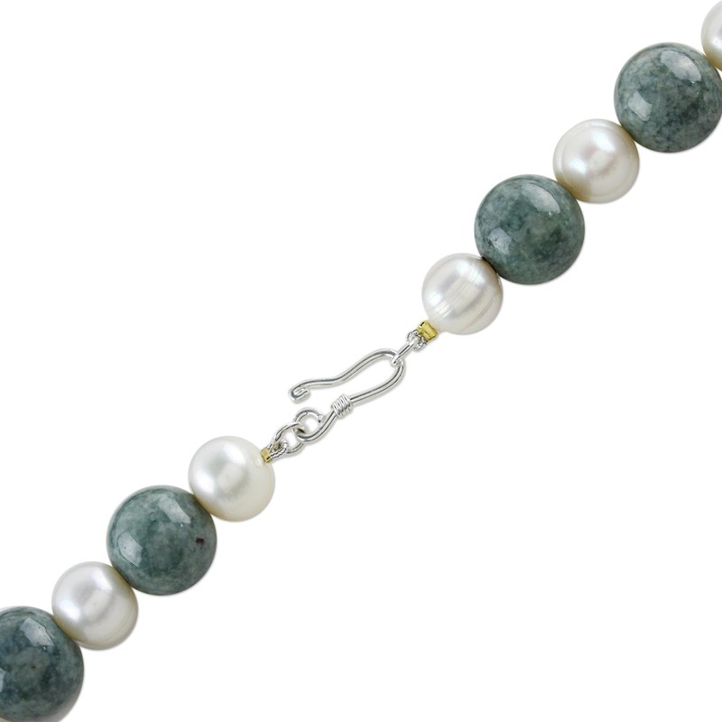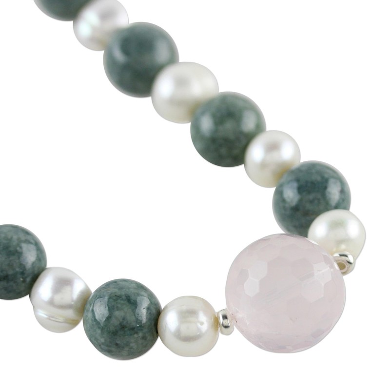 About this item: A 38-carat stone of natural rose quartz centers this necklace, flanked by petite beads of sterling silver. Featuring alternating colors of green and white, this pendant necklace from Thailand is designed by Matta, beaded with dyed quartz and cultured freshwater pearls.