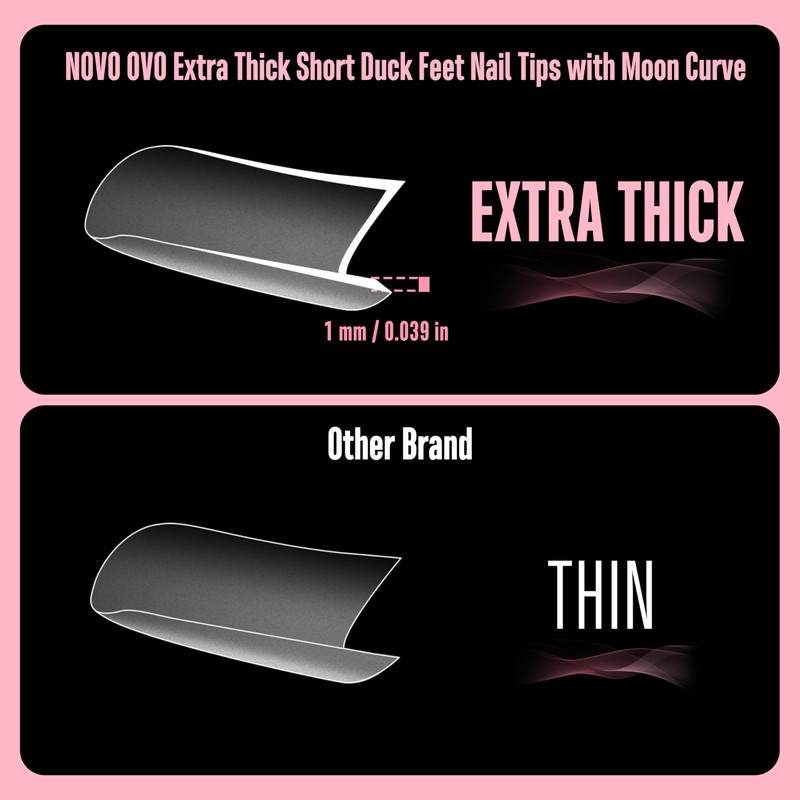 • PROFESSIONAL-GRADE RESULTS: Whether you’re a seasoned nail technician or a DIY enthusiast, the NOVO OVO Extra Thick Nail Tips are your ideal choice for achieving salon-quality results effortlessly. We offer Almond, Coffin, Oval, Square, Duck Feet, Curved Square, Curved Stiletto for manicures, and Tapered Square for pedicures, empowering you to create stunning nail enhancements with confidence and precision.