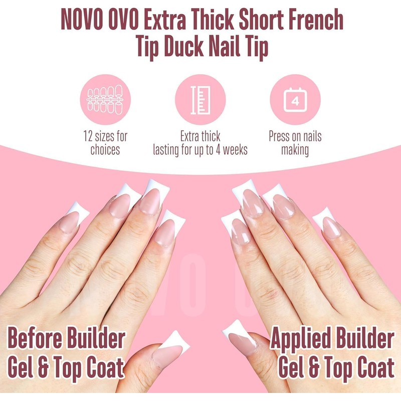 - GET A SIMPLE FRENCH TIP DUCK NAIL PEDICURE WITH JUST 3 STEPS: NOVO OVO pre-designed nails are here to make your manicure easier! We've already applied a tip primer and base coat on the soft gel nail tips. Simply stick them on your nails with UV gel or glue, then add a layer of builder gel and top coat. In just 15 minutes, you'll have stunning French Tips duck nails on your hand!