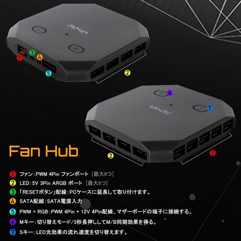- 【Multi-function Controller】 Designed for motherboards without 3 pin terminals. Equipped with a 12V 4PIN cable, it can be converted to 5V 3PIN. (Only can sync with 12V RGB motherboard) 1. Newly developed integrated fan hub, compact and space-saving design makes cable management easier. ✎ Expands up to 14 independent fans, allowing users to significantly expand the cooling capability in the aircraft and improve system performance. ❸ Motherboard Control/M Button Control/S button control control the light flow speed