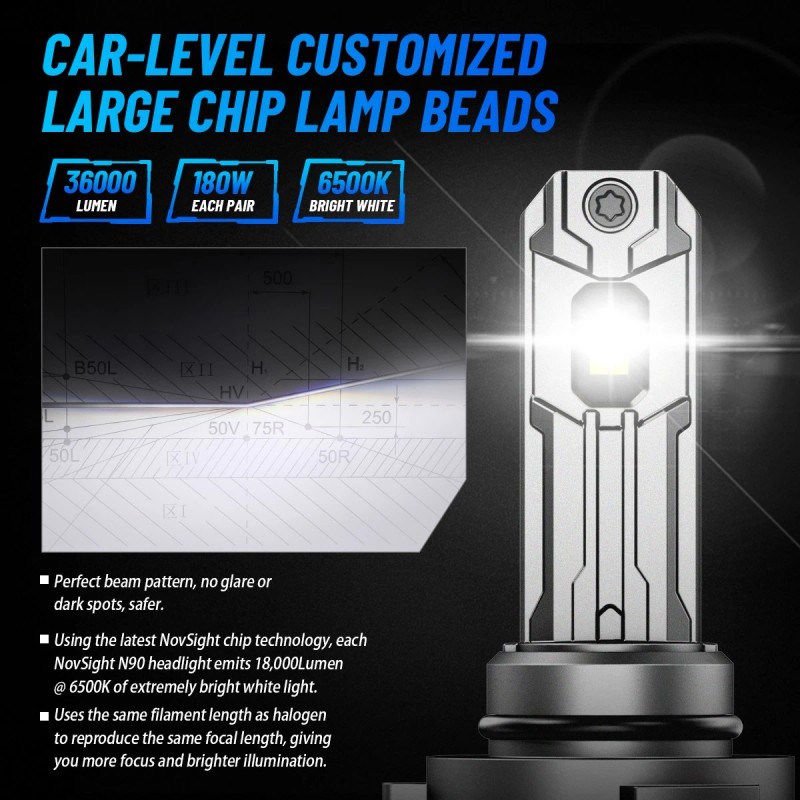 【Super Bright】---Utilizing 12PCS 6063 LED chips per side, boasting an impressive 180W output and, 36000LM per pair. These lights emit a more intense illumination, surpassing halogen lights by a remarkable 1200% in brightness and standard headlights by 900%!
