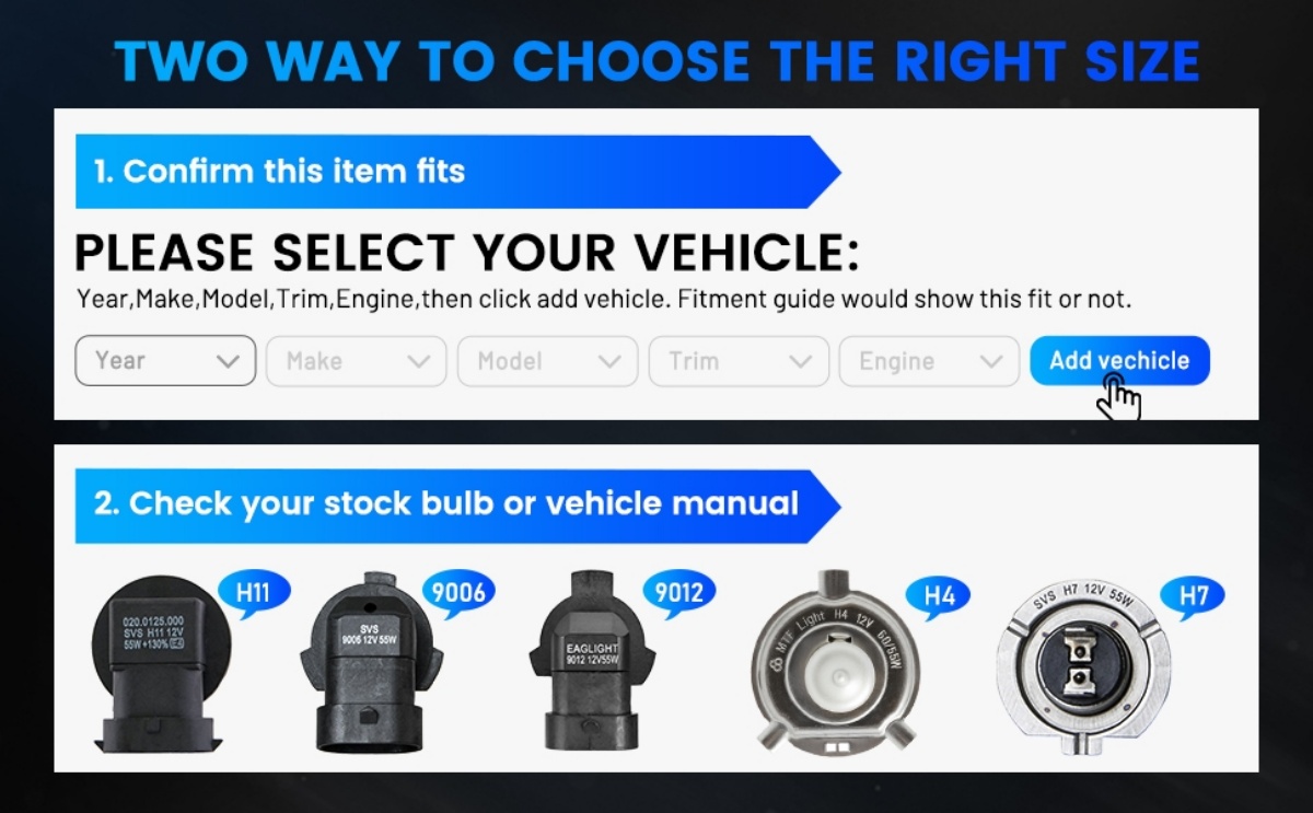 3. If you are unsure your bulb type, please do remember send message to tell us your car make, model, year and other information which is helpful to check bulb type. for example: