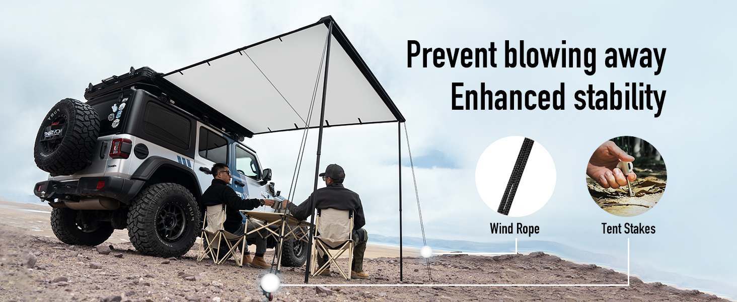 Multi Functional: This car awning is suitable for installation on vehicle roof railings, providing 2m*2m shade, standing in calm conditions to block sunlight, rain, and wind, providing outdoor rest and enjoying natural space.