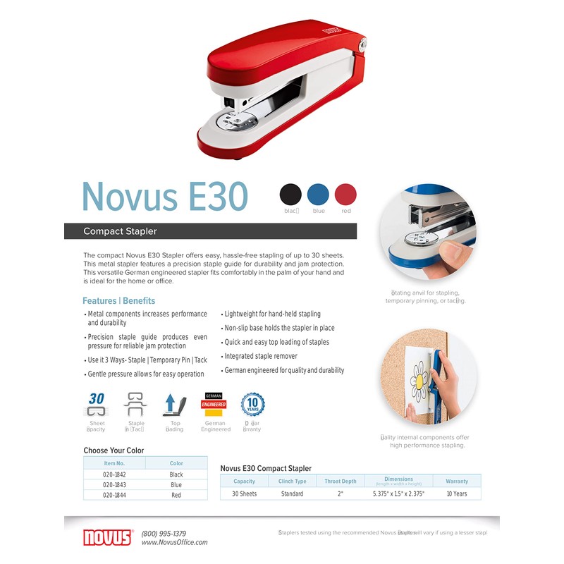 Novus E30 Compact Stapler, 30 Sheet Capacity, Metal With Precision Staple Guide, German Engineered, Staple|Pin|Tack, 10 Year Warranty, Red (020-1844)