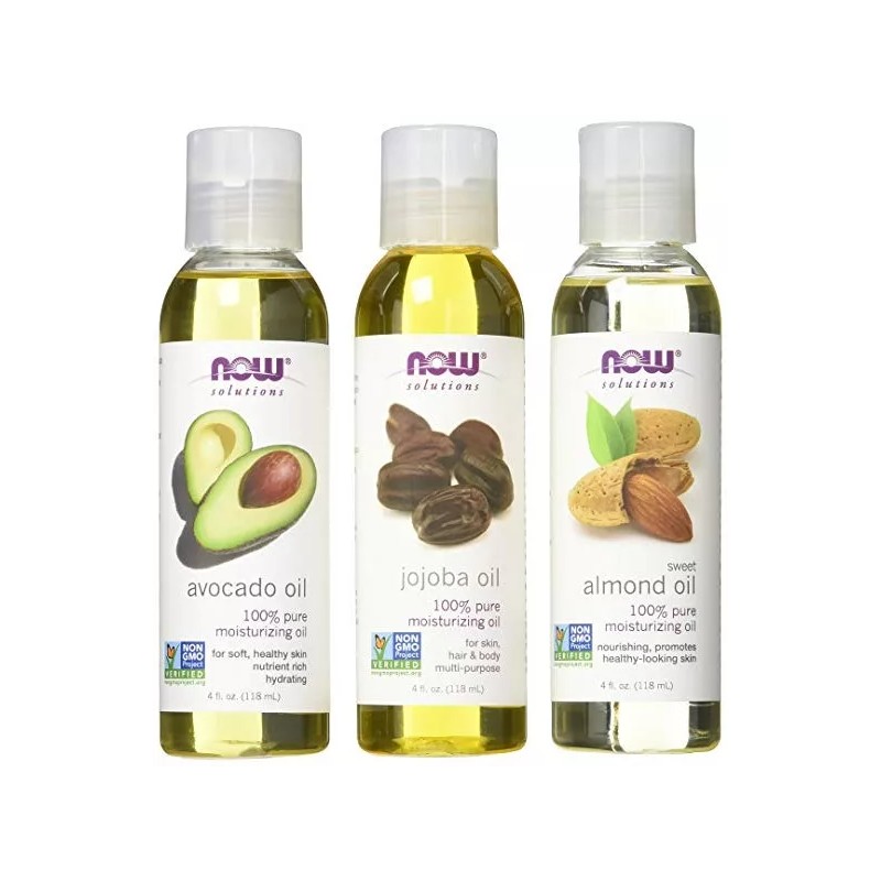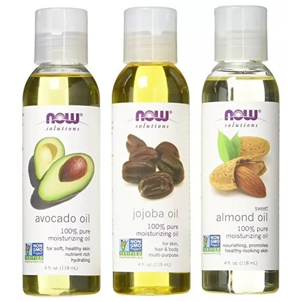 100% puro aceite hidratante; nutritiva; Promueve una piel sana; Variety Pack incluye: almendras dulces, de aguacate, de jojoba y aceite - 4 onzas; Tres 4 oz botellas Ahora Aceites variedad de alimentos hidratantes Sampler: almendras dulces, de aguacate, de jojoba y aceites - 4 oz botellas cada una Todos nuestros productos estan en inglés SKU 4061903566