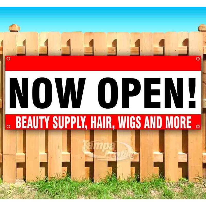 Now Open - Beauty Supply Hair Wigs And More Banner 13 oz | Non-Fabric | Heavy-Duty Vinyl Single-Sided With Metal Grommets