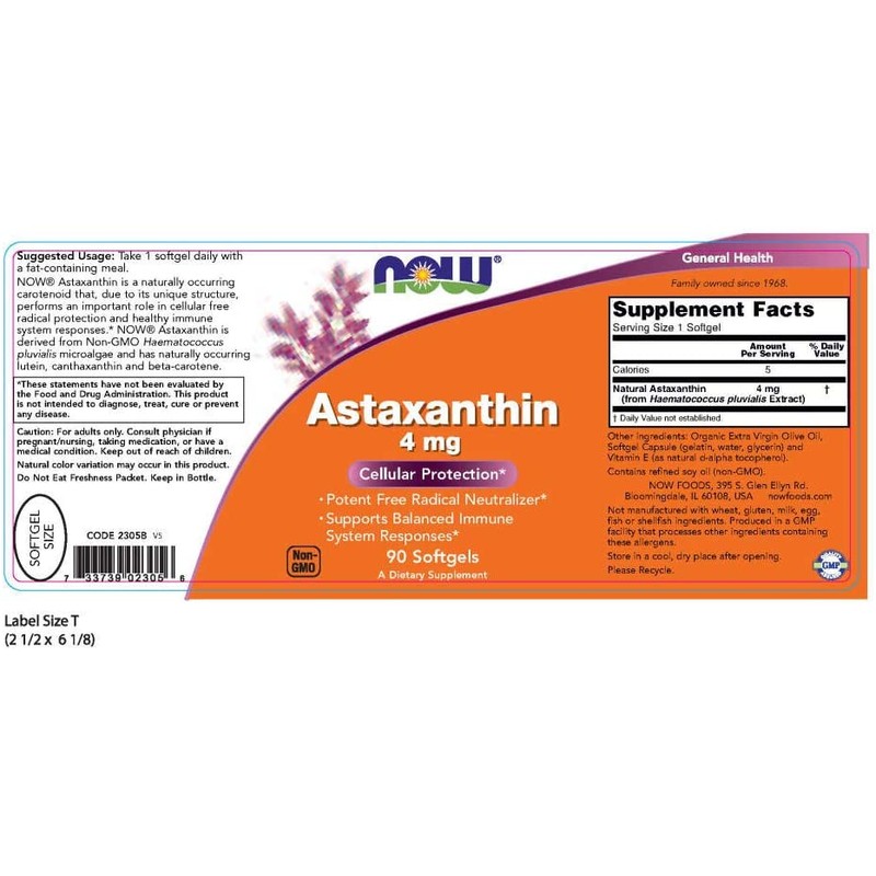 • NOW Astaxanthin 4 mg softgels are derived from Non-GMO Haematococcus pluvialis microalgae and has naturally occurring lutein, canthaxanthin, and beta-carotene.