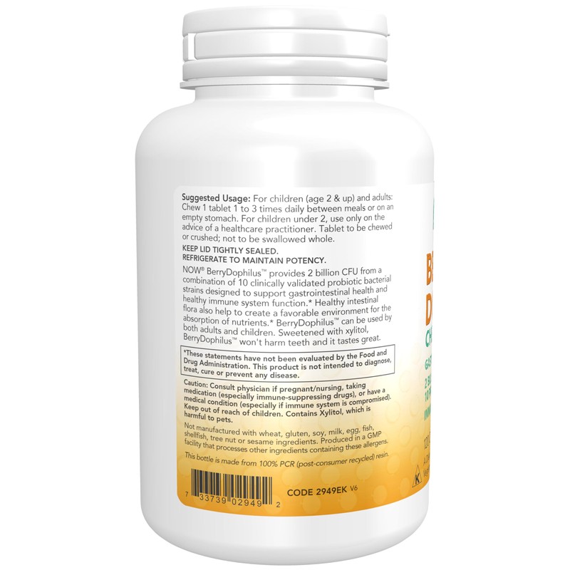 NOW Foods Supplements, BerryDophilus™ with 2 Billion, 10 Probiotic Strains, Xylitol Sweetened, Strain Verified, 120 Chewables, packaging may vary