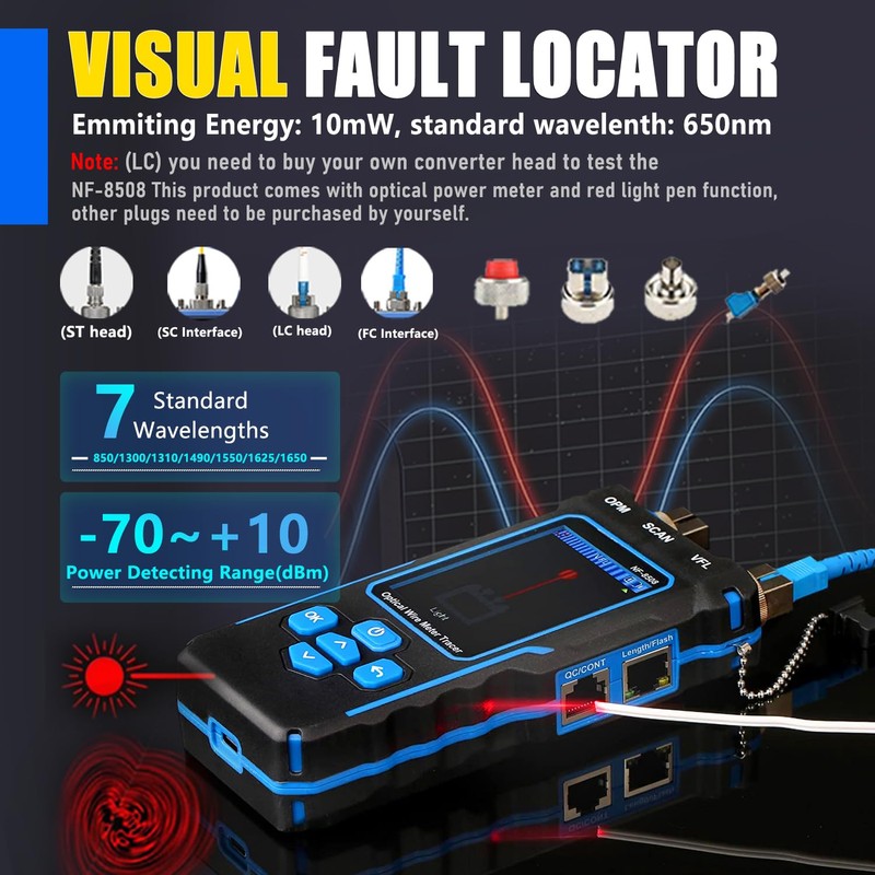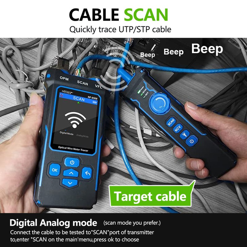 - 9functions of network cable tester: NF-8508 (transmitter) continuity test, cable scan, port flicker, cable length measurement, PoE test, crystal head QC test, OPM (optical power meter) and VFL (visual fault location) NVC function